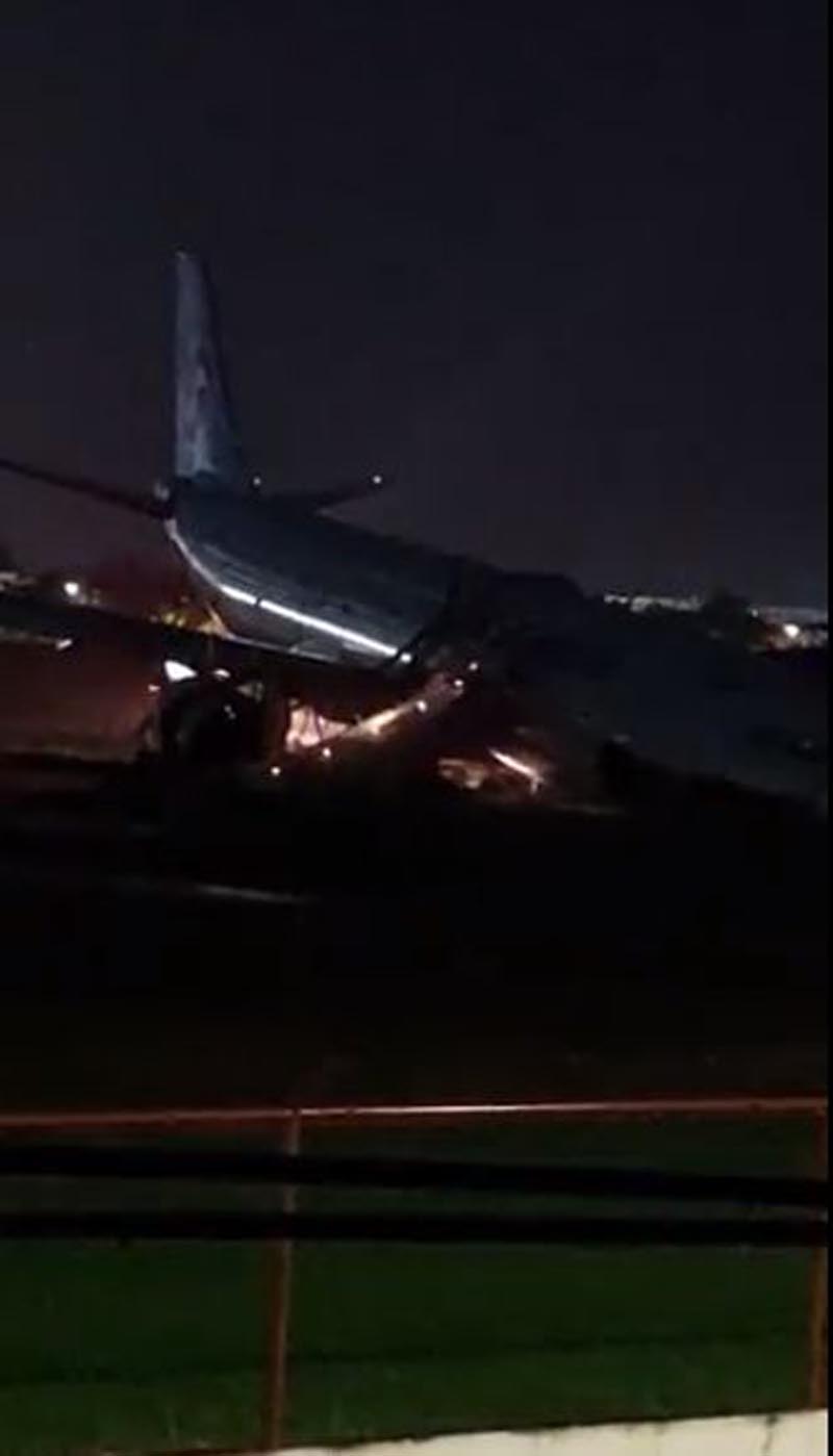 ▲机腹受损严重,机舱门的紧急逃生滑道已展开。美联社
