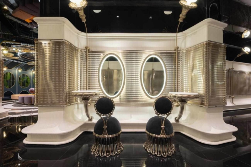休息区的沙发同样兼具设计感,暖橘色的色调加上沙发的圆角设计也让整个空间更为柔和。化妆间的墙面沿用了双层表皮的理念,采用木饰面板搭配香槟金色的艺术格栅,并用椅子、化妆台和墙角的圆弧设计打破了金属的生硬感。