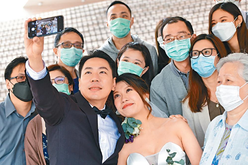 ▲疫情期间的限制逐步放宽,参加婚礼等聚会不用再戴口罩合照。