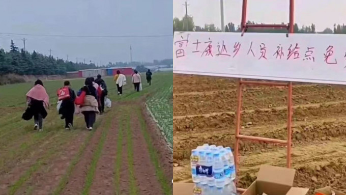 ▲郑州富士康工人为“逃疫”徒步返乡,路边有热心人放置矿泉水等。网图