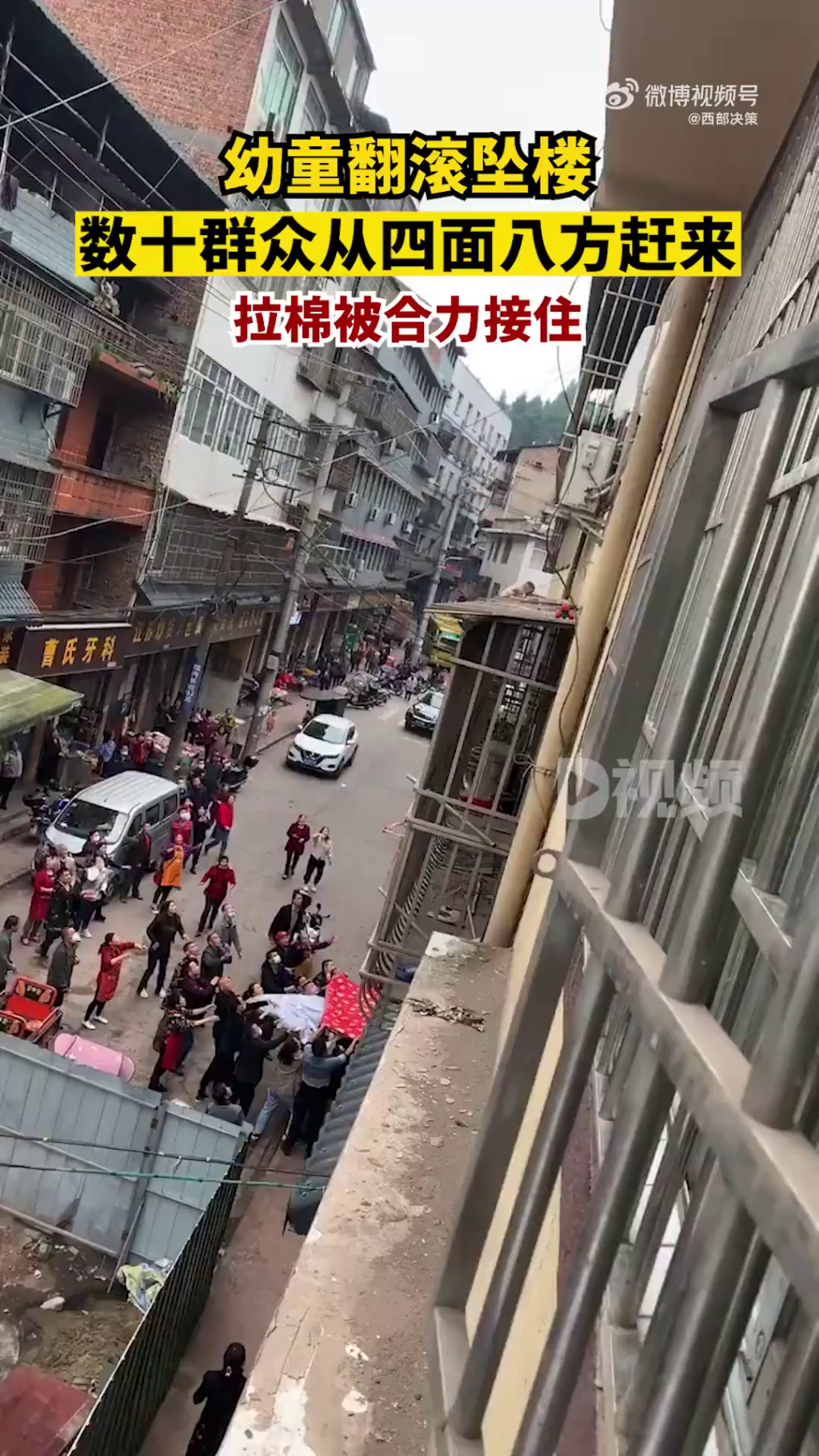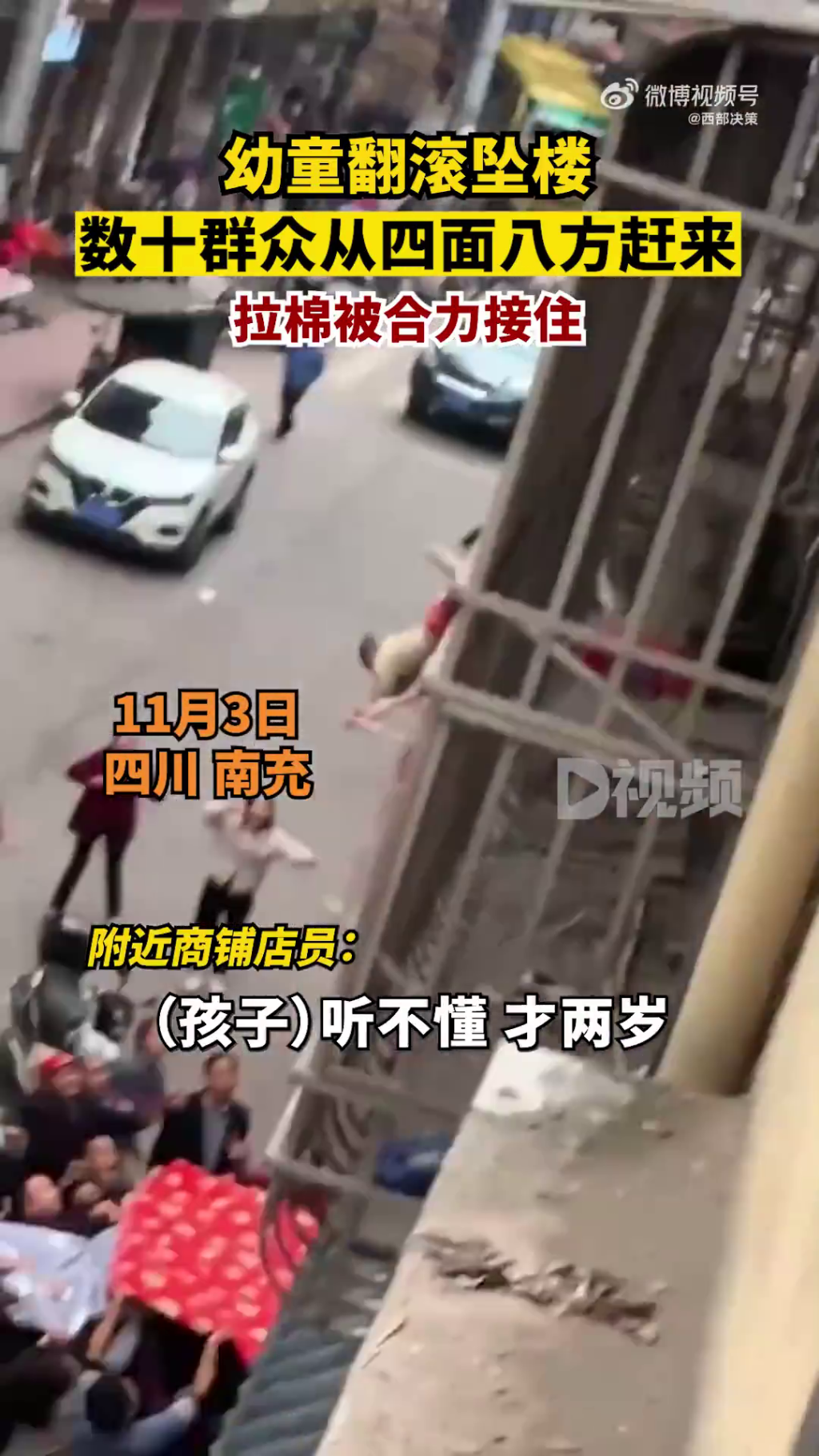 在四川南充,一名2岁多的幼童从窗户爬了出来,很多街坊邻居发现后急忙到家中取床单,大家都对小孩叫喊,着他不要动,数十群众从四面八方赶来拉起棉被,结果男孩一个翻身真的堕楼了,幸好一众街坊拉起床单、棉被接到了,孩子没有受伤,不过受到惊吓一直在哭,大家看到他没甚么大碍才放下心头大石,对此成功救援男孩,众人都很开心。