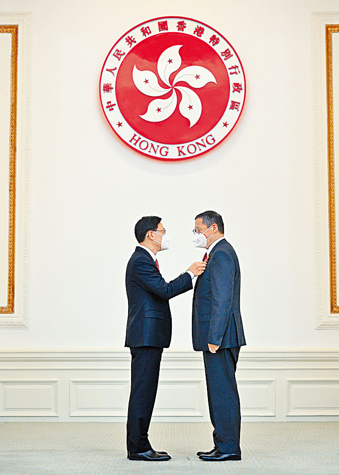 2022年度授勋典礼昨起一连三日在礼宾府宴会厅举行,疫情关系,典礼闭门进行。今年度授勋名单总共889人,是特区成立以来人数最多的,行政长官李家超在首日典礼上逐一颁授勋衔和奖状予其中148人。
