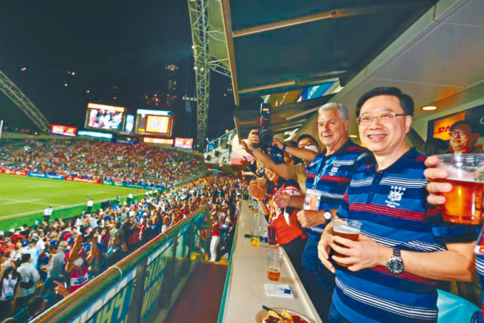 ▲行政长官李家超昨夜担任七榄决赛颁奖嘉宾前,不忘与众同乐,边喝酒边看决战。