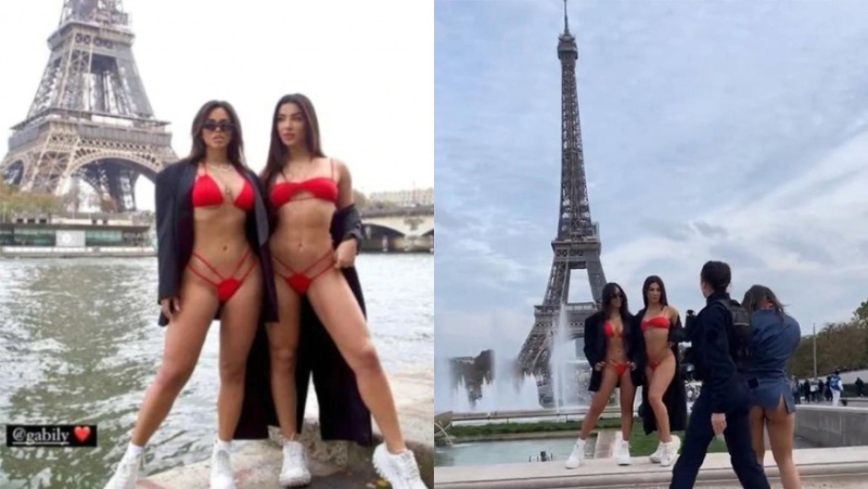 报道指,两名女网红24岁的女网红加布里埃尔(Gabriela Versiani)与27岁的盖比莉(Gabily),正在巴黎铁塔前拍照,期间两女脱掉身上外套,身上竟然只有穿着清凉的比基尼。帮她们拍照的凡妮莎(Vanessa Lopez)声称,她们差点被逮捕,她们向警方解释正在拍摄比基尼广告,警方告知她们不能这样,半裸照是违法的。
