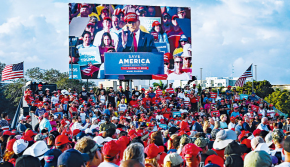 ▲特朗普周日(6日)在佛州迈阿密的共和党造势集会上发言,为参议员鲁比奥拉票。