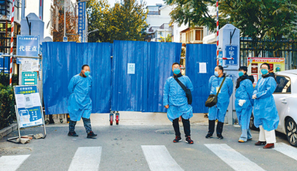 ▲北京一个小区被封控,身穿防护服的人员在门外把守。