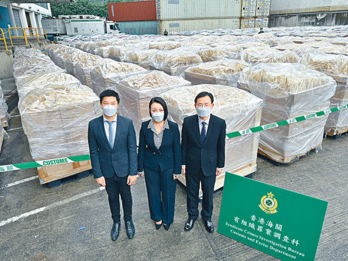 走私集团再被重创,损失3亿港元名贵私货。海关有组织罪案调查科高级监督李艷萍表示,犯罪集团最初利用快艇、渔船、趸船及内河船进行走私,但被海关多次重击,蒙受不少损失,私枭于是改变走私模式,利用远洋船运载大量合法进出口货物来掩饰私货,并拣选较远的目的地,意图增加海关执法难度,幸而海关早前接获相关情报,上月26日突击搜查一艘报称运载10个内藏亚加力胶的货柜、前往天津的远洋船。