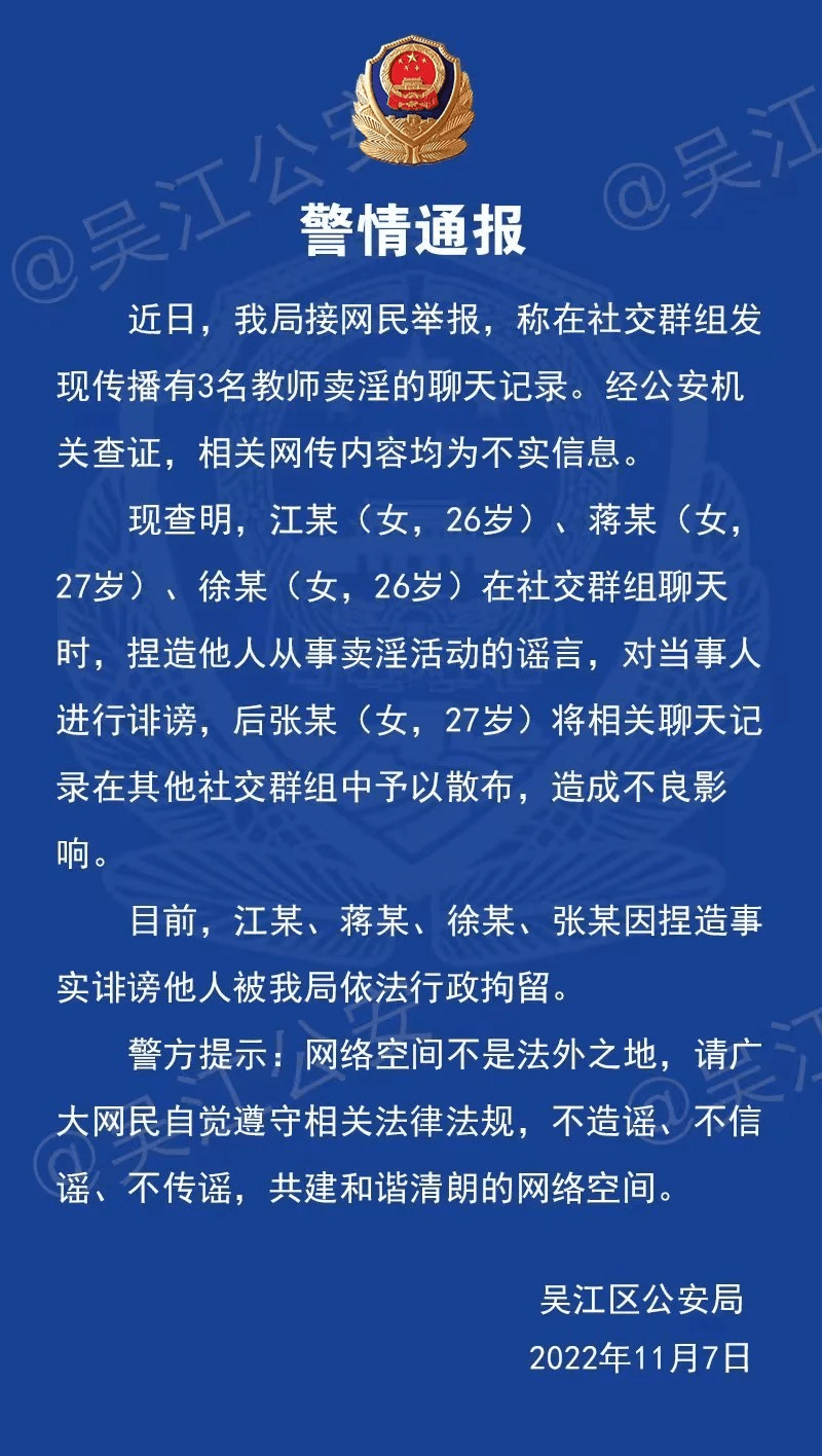 近日,我局接网民举报,称在社交群组发现传播有3名教师卖淫的聊天记录。经公安机关查证,相关网传内容均为不实信息。