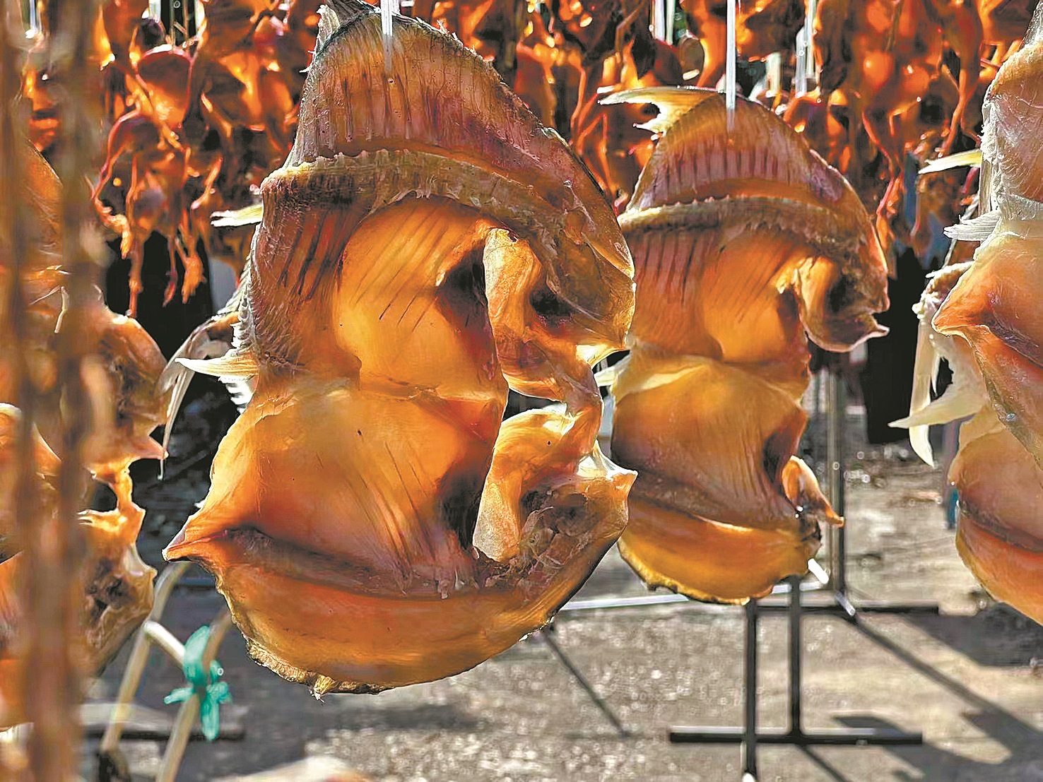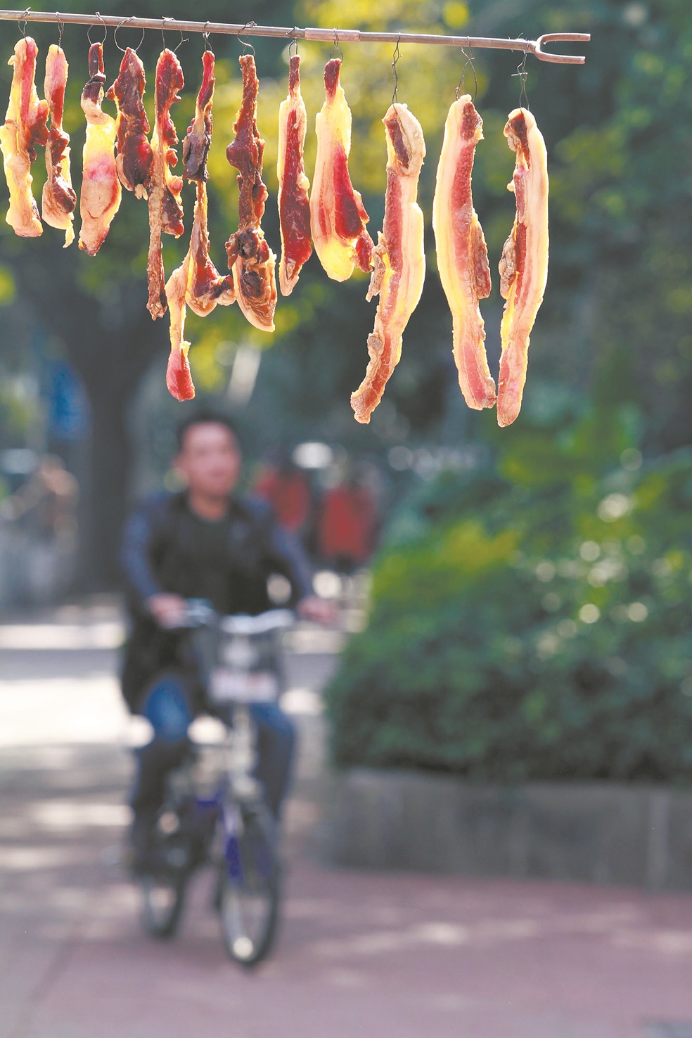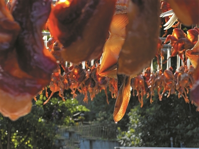 ▲腊味在阳光下反射出鲜艳的光泽。谢丽梅 摄