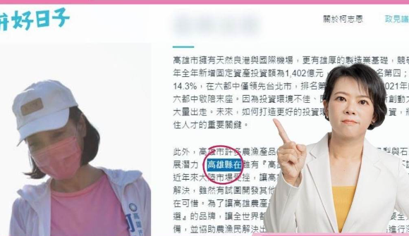 黄侦琳指出,柯志恩9月宣布官网正式上线,而柯志恩官网上的政策论述出现“‘高雄县在’虽有高雄首选的品牌”的离谱错字,她看到“高雄县”3个字不禁想问,难道柯志恩活在过去的平行时空?且柯志恩官网9月上线至今都未更正,凸显了对政策不熟悉、更对高雄无心。