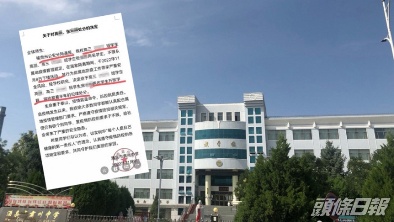 接肃州公安分局通报,酒泉市肃州中学高三学生高某、张某,不服从属地疫情管理规定,在居家隔离期间,于周二(8日)下楼活动。学校认为,上述两名学生的行为给属地防疫工作带来严重安全风险,经学校研究,决定将两名学生学籍开除、留校察看半年的纪律处分,处分决定中还提到,生命重于泰山,疫情就是命令,防控就是责任。事件在网上流传后,引发争议。