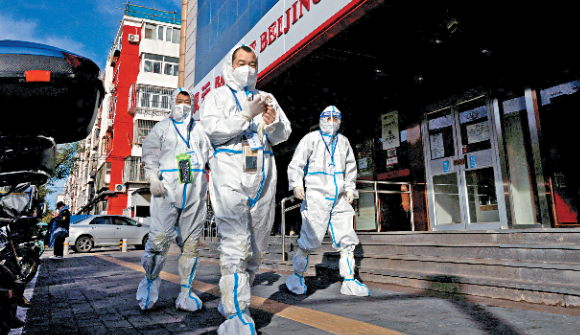 ▲北京疫情持续升温,防疫人员在街头巡逻。路透社