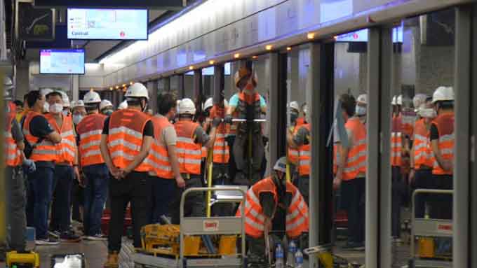 ▲港铁指昨天早上事故后,职员按程序开启车门让乘客在月台旁边离开车厢。