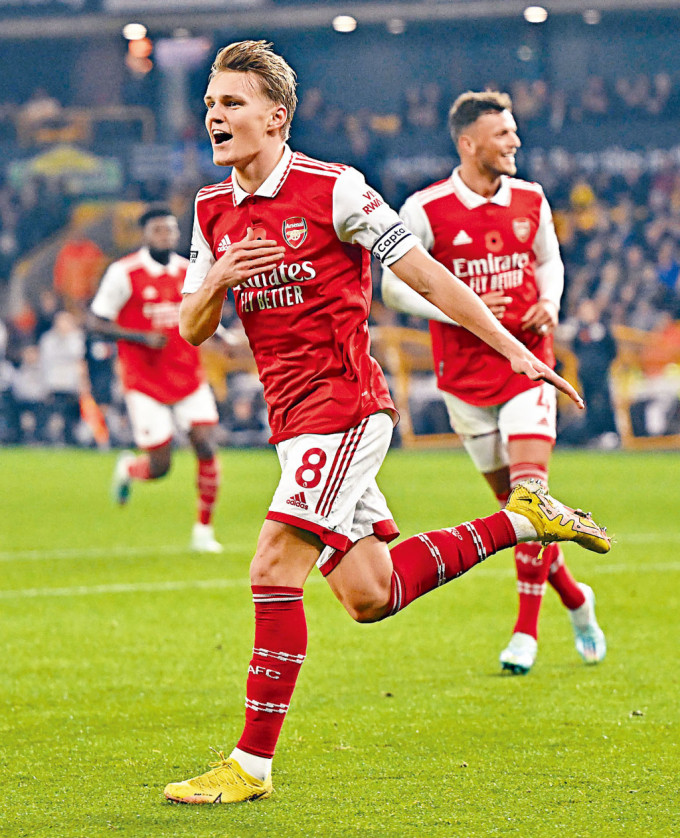 距离世界杯开幕剩余六日,备战世杯的球星近期为球会比赛都小心翼翼,以免在这最后阶段因伤而缘尽世杯。然而,不少无缘出席世杯的球星就没有这个忧虑,于周六联赛都全力以赴为球会取胜,阿仙奴的挪威中场奥迪加特便是其中之一。此子周六梅开二度率枪手作客赢狼队2:0,领先次席曼城五分进入世杯休战期,兼且是十四年来首度成为圣诞“冠军”。