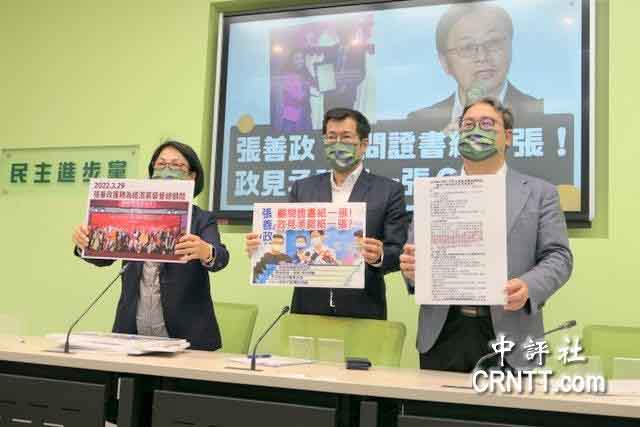 ▲民进党团召开“张善政顾问证书纸一张!政见承诺纸一张?”记者会。来源:中评社