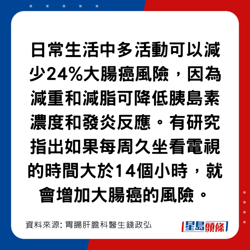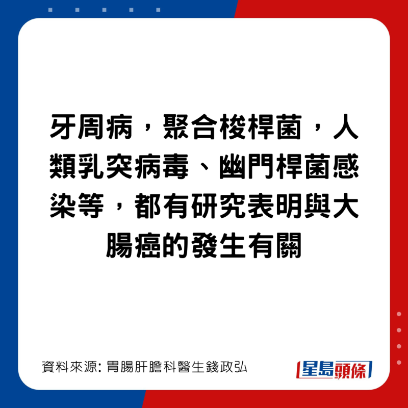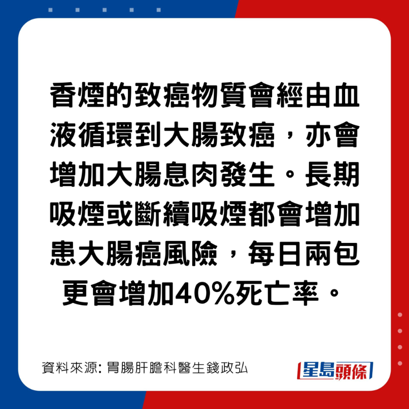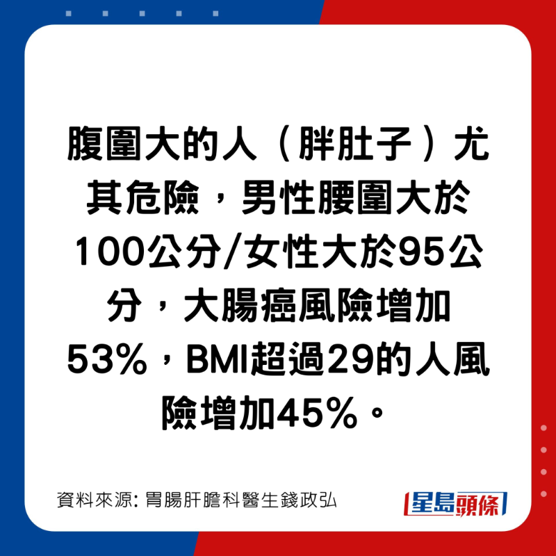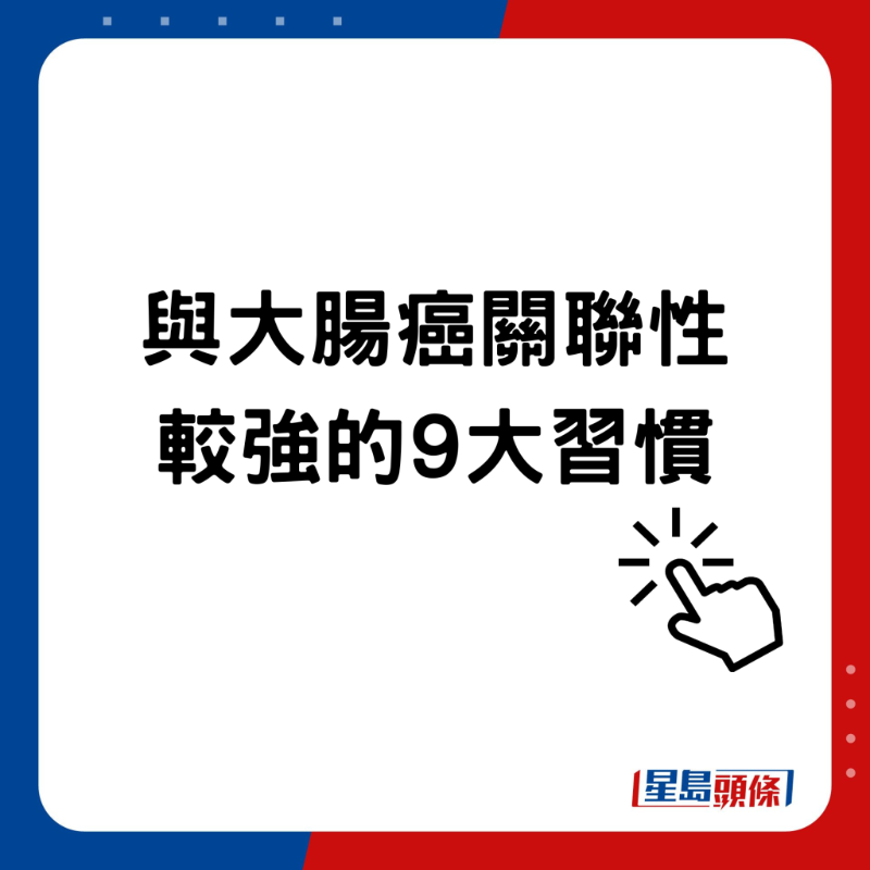钱政弘医生曾经其Facebook专页表示,大肠癌有一些危险因素,除了一些无法改变的因素,如家族史、基因遗传、人种外,有不少因素都与生活习惯有关,并可分为关联性较强及关联性一般。以下9个因素致癌风险较明显: