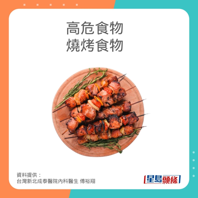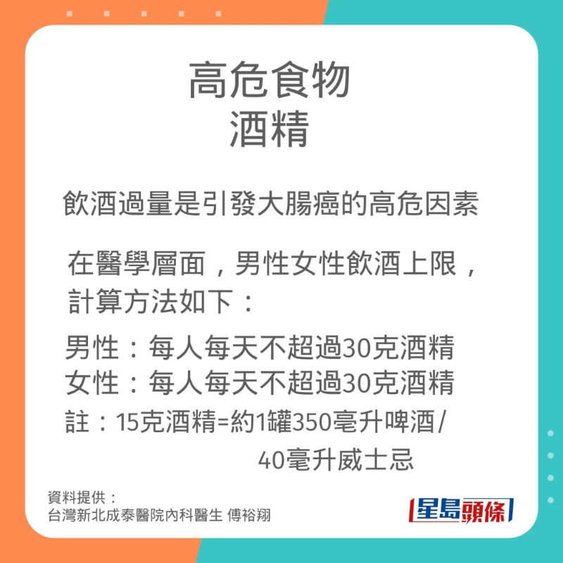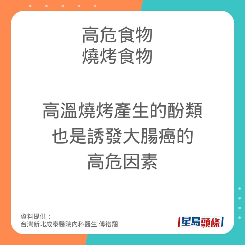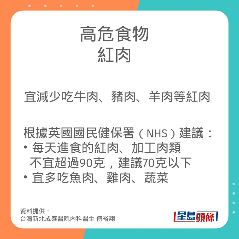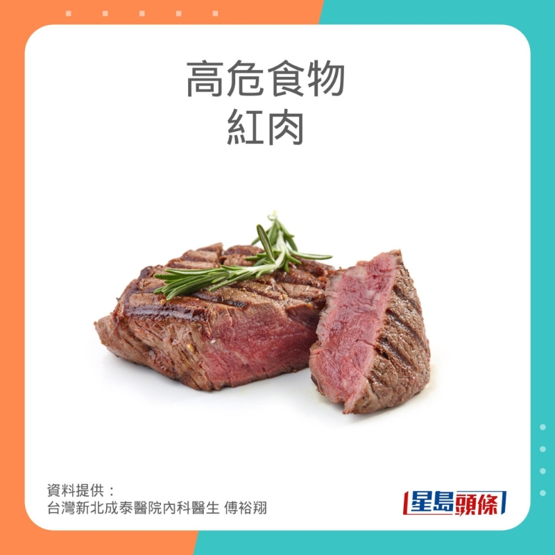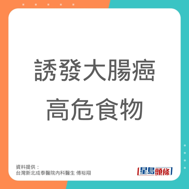 台湾内科医生傅裕翔亦曾指,以下6类常见的食物、饮品为诱发大肠癌的高风险因素,原因及进食建议如下: