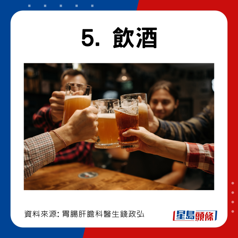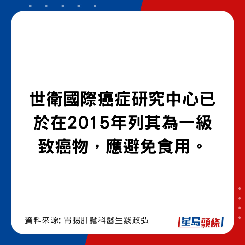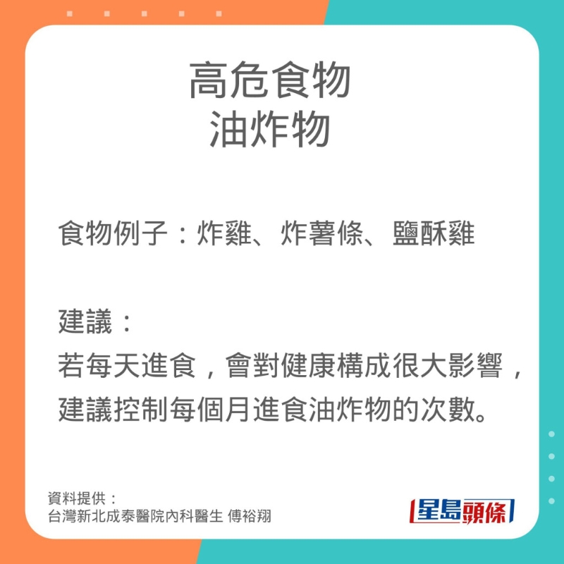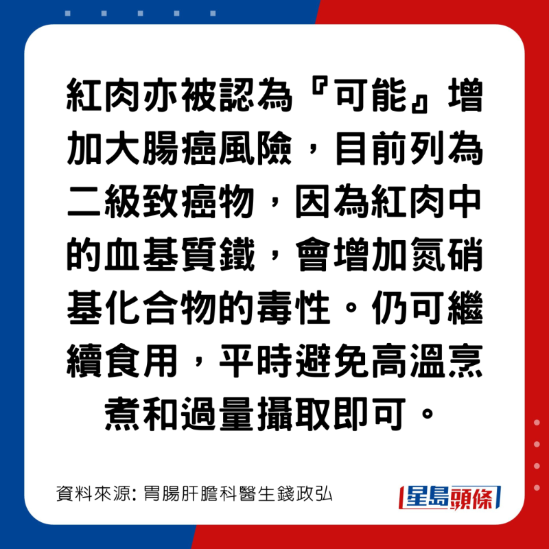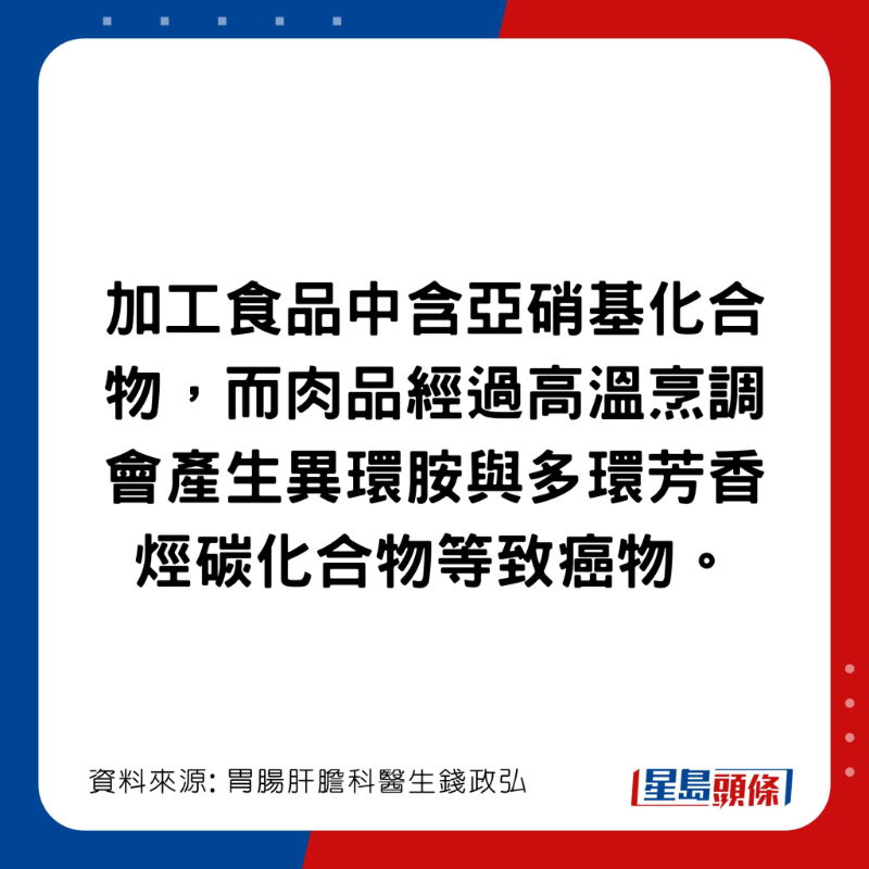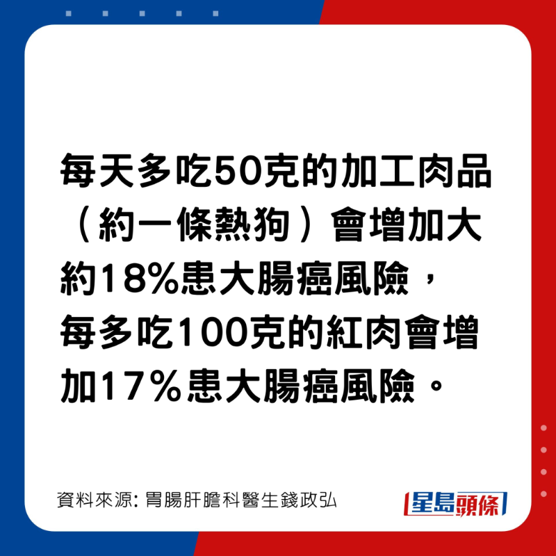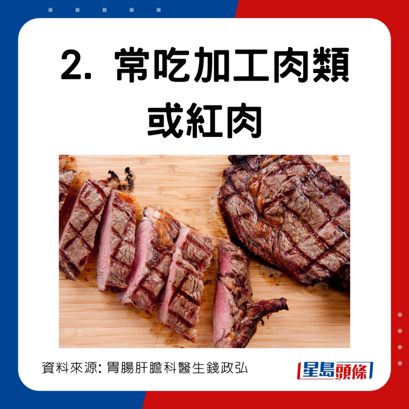 台湾内科医生傅裕翔亦曾指,以下6类常见的食物、饮品为诱发大肠癌的高风险因素,原因及进食建议如下: