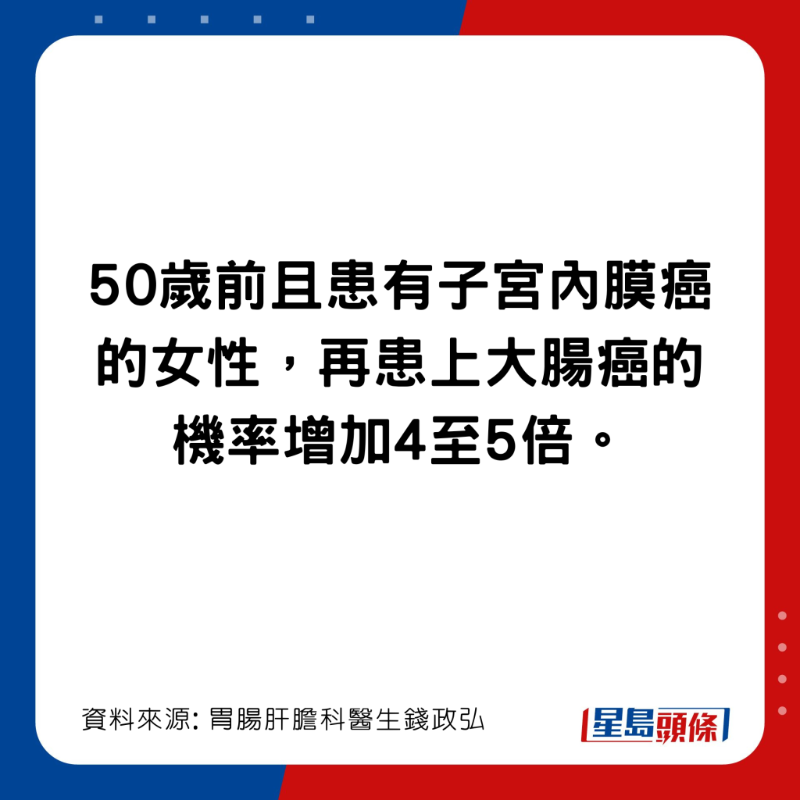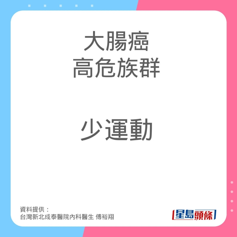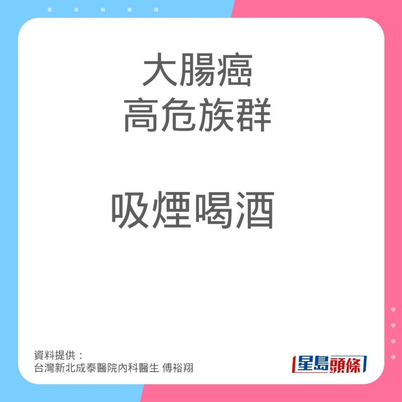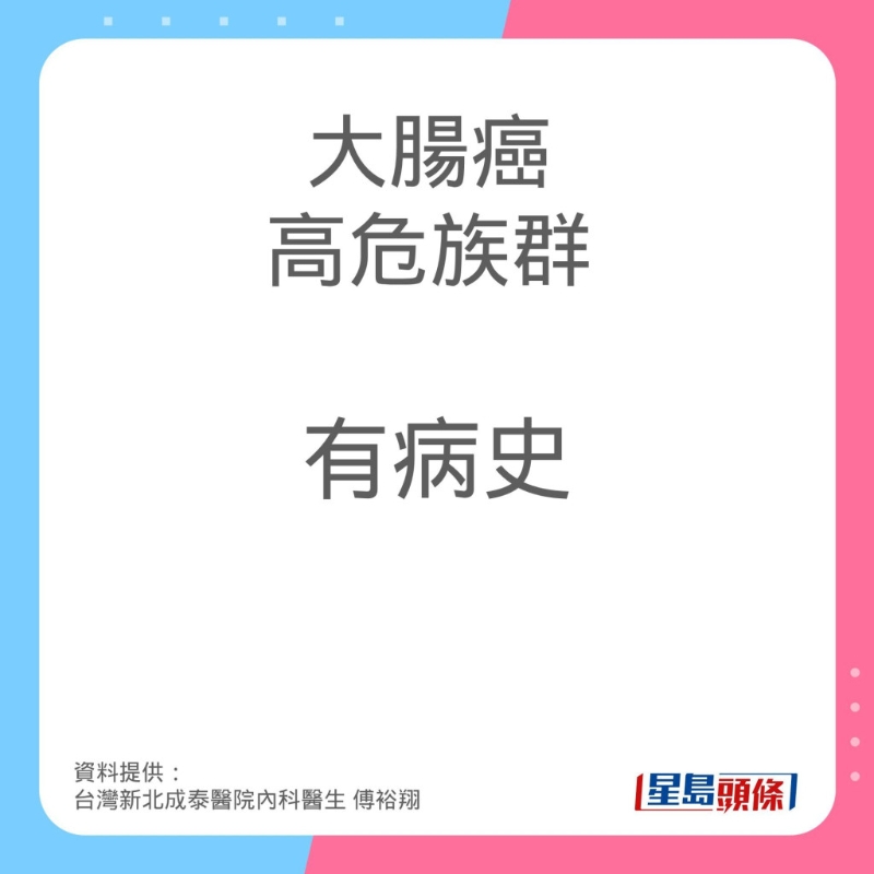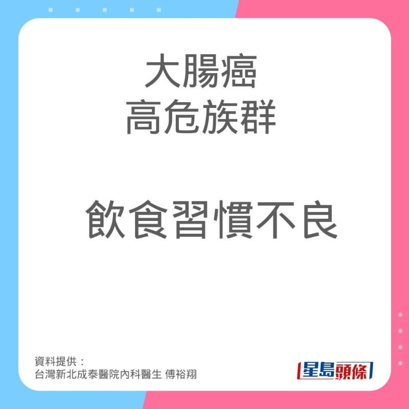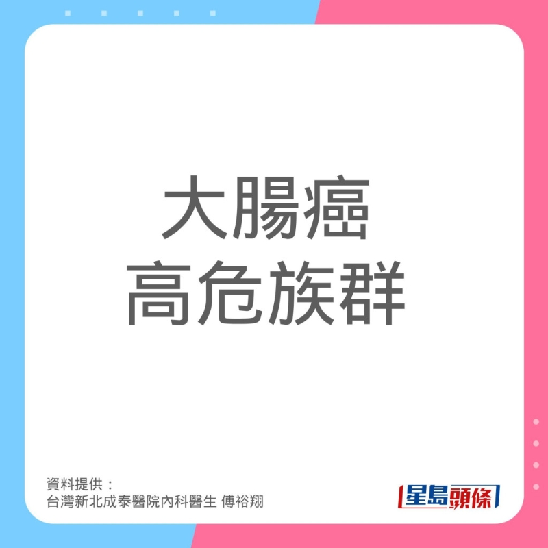 台湾新北成泰医院内科医生傅裕翔亦曾发文指出,有6类人士患大肠癌的风险较高: