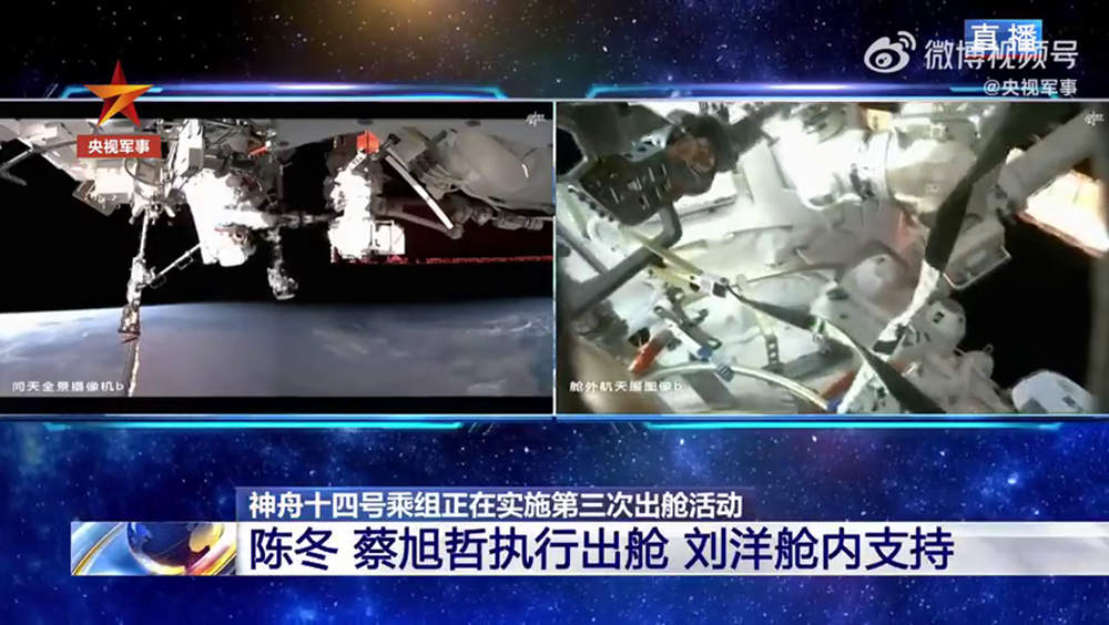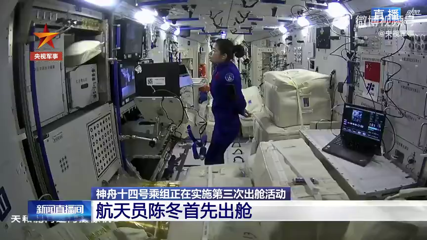 ▲航天员陈冬已出舱,蔡旭哲即将出舱,刘洋则在核心舱内配合支持。