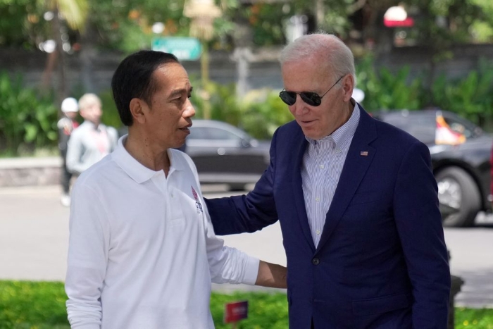 ▲拜登16日受邀到峇厘岛拉莱(Ngurah Rai)红树林公园参访,一身深蓝色西装与印度尼西亚总统佐科威(Joko Widodo)并肩走上楼梯。路透社