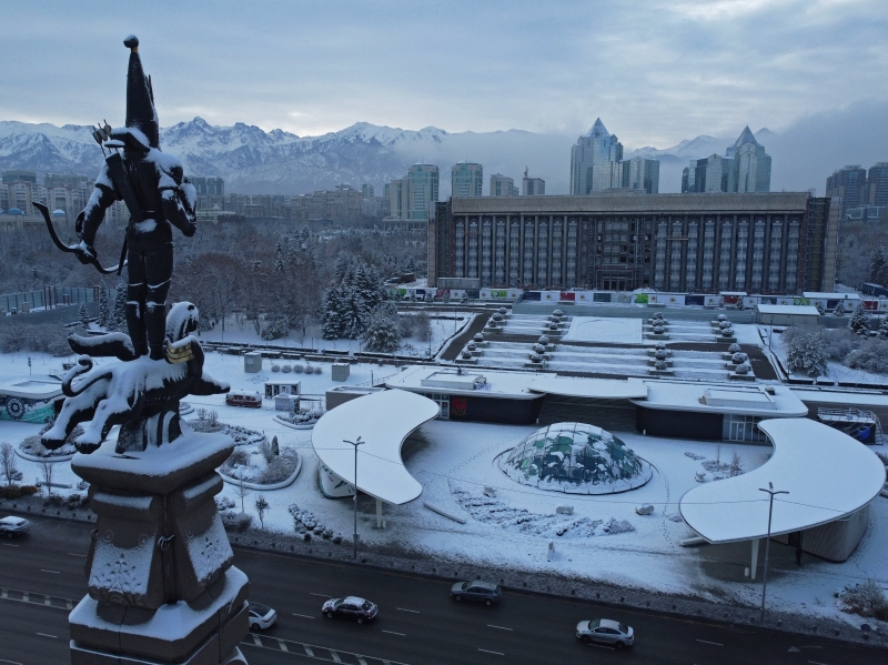 ▲11 月 17 日,哈萨克斯坦阿拉木图市政府总部前的独立纪念碑。Reuters图