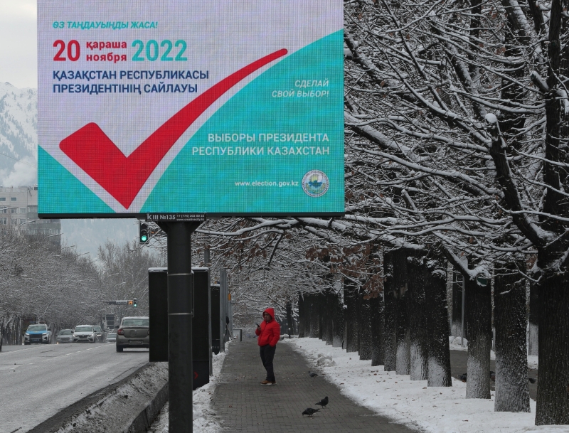 ▲在阿拉木图,一名男子站在总统选举宣传海报下,海报上写着选举将于今年 11 月 17 日举行。Reuters图