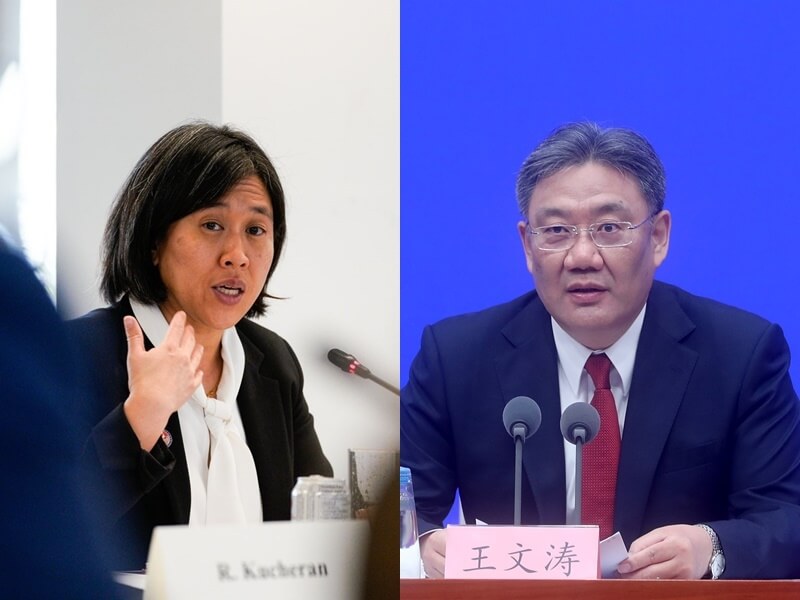 ▲美国贸易代表戴琪(左)18日与中国商务部长王文涛(右)在APEC场边会晤,讨论美中双边贸易议题。(左图取自twitter、右图中新社)