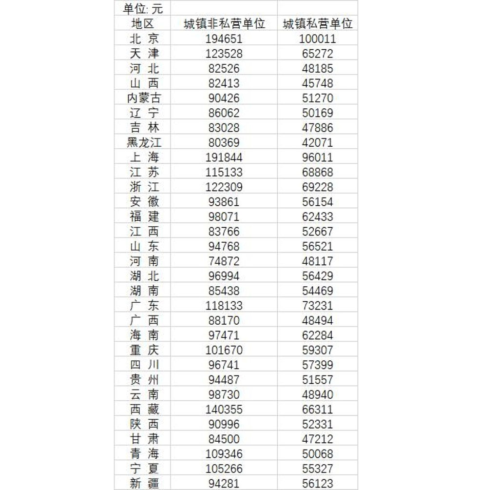 从省份区分,北京、上海的非私营单位平均工资都超过了19万元,遥遥领先。令人意外的是,西藏以超过14万元拿下第3,其他超过10万元的除了天津、浙江、江苏、广东、重庆等直辖市与富裕省外,也包括青海、宁夏等偏远与人口稀少的省份与自治区。