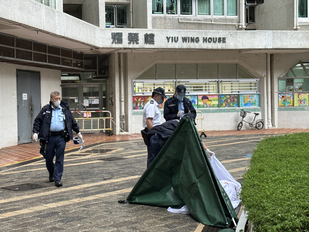 今(22日)晨7时48分,马鞍山耀安村耀荣楼一名男子从高处堕下,飞堕大厦对开花槽旁,途人发现报警,救护员到场证实已气绝身亡,毋须送院,警方盖上遮尸帐篷,同时登楼追查死者身世及轻生原因。