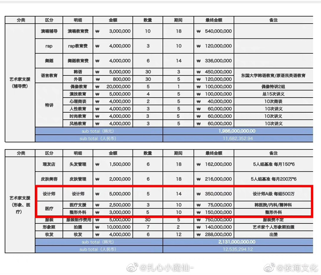 紧接着,前(20日)依海娱乐又发出一份开销明细,曝光包括演艺培训、服装美容、语言训练的成本开销,其中一项还是安排去整形外科的费用,一看竟高达1.5亿韩币(约80万人民币),虽未点名是让谁去整形,但时机之巧合,让粉丝疯猜很可能是在针对蔡徐坤。截至目前为止,蔡徐坤并未做出任何回应。