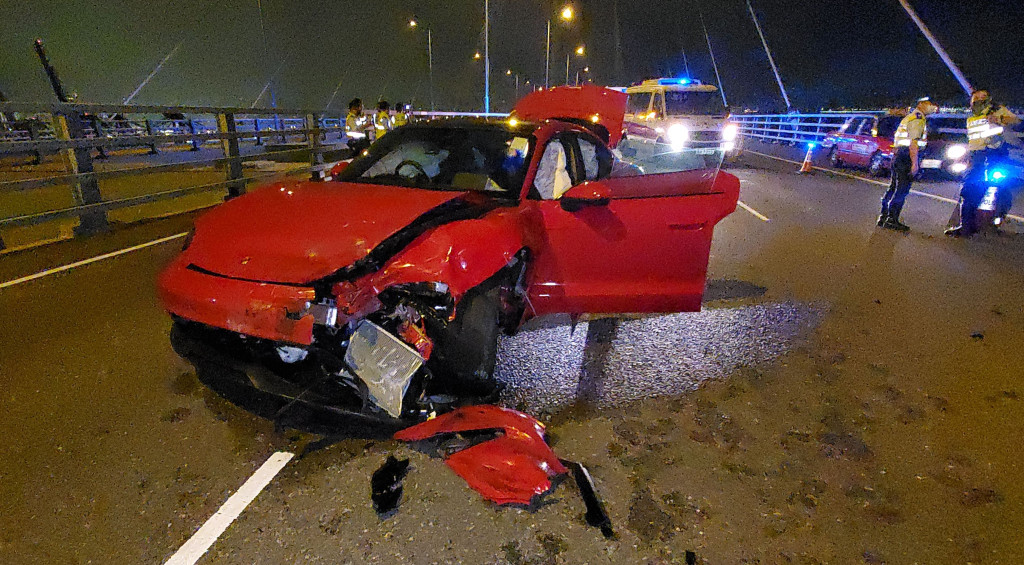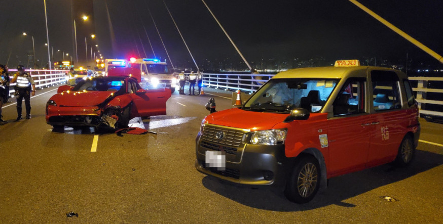 昂船洲大桥今早(23日)约1时发生交通意外,1辆计程车及1辆保时捷电动跑车先后沿上址往大屿山方向行驶,当途至近南湾隧道入口前一段桥面,2车突发生相撞,其中跑车左边车头损毁、计程车右车尾毁烂。其他驾驶人士目击车祸,担心保时捷跑车司机昏迷车内报案。