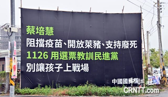 不过,国民党方面并没有默不作声,直接在蔡培慧攻击文宣旁另立大型看板反击,上面写着“蔡培慧阻挡疫苗、开放莱猪、支持废死,1126用选票教训民进党,别上孩子上战场”,看板内容直捣蔡培慧痛点,两个看板距离仅50米。