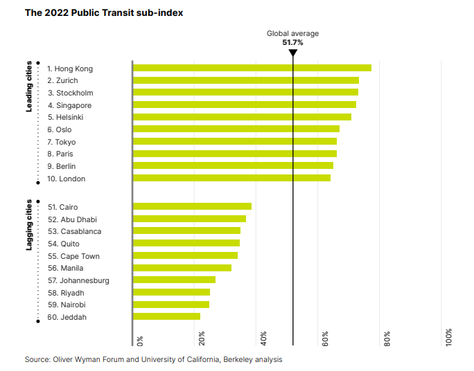 研究评估全球60个城市的公共交通系统,比较各城市公共交通的距离、负担能力、运营时间、拥挤程度及到达地点的时间等因素。在评估的60个城市中,亚洲和欧洲城市排名最高,而中东和非洲的城市中心排名最低。排名显示香港在全球公共交通指数位列第一,指数接近80,高于苏黎世及斯德哥尔摩等地;而全球平均指数为51.7。