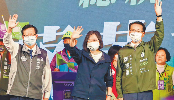 ▲蔡英文(前排中)24日晚间到桃园市八德区与桃园市长郑文灿(前排左一)一同为民进党桃园市长候选人郑运鹏(前排右一)站台助讲,希望支持的民众投票日当天风雨无阻,一定要去投票。中时资料图