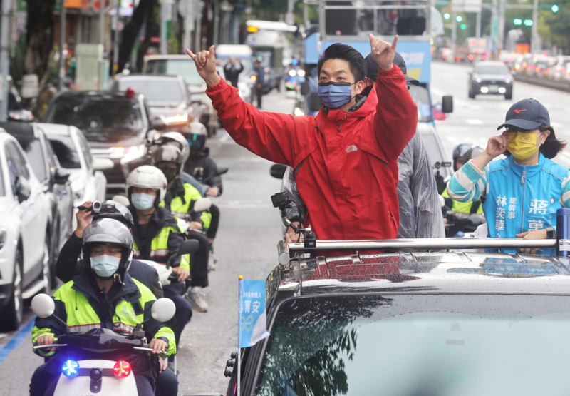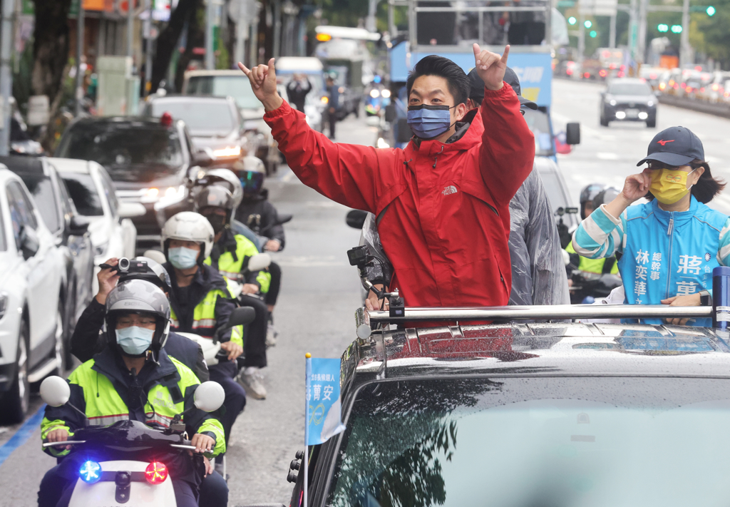 ▲国民党台北市长候选人蒋万安(右)以车队扫街进行最后冲刺,沿途比出“六”向民众请托。