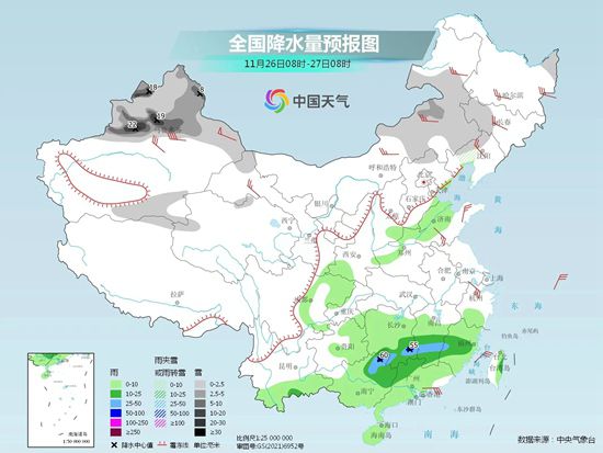 近期,降水最频繁的地方在新疆北部以及长江以南地区,其中新疆北部自11月20日以来持续降雪,多地累计降雪量已经达到40毫米以上,局地超过60毫米。