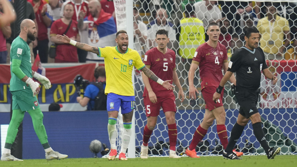 ▲内马尔被塞尔维亚球员踢伤。 AP