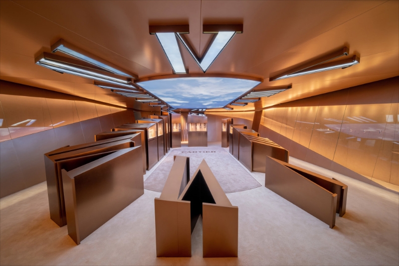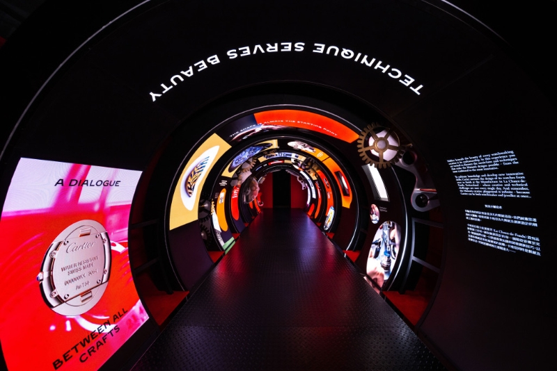 以“对美不懈追求”的主题概念空间,带领参观者投入探索卡地亚以技术追寻美学的制表理念。红黑通道顶部和墙身皆嵌入了巨型平衡摆轮、游丝及其他部件。屏幕播放着来自瑞士拉夏德芳制表工作坊和艺术大师工坊的故事。