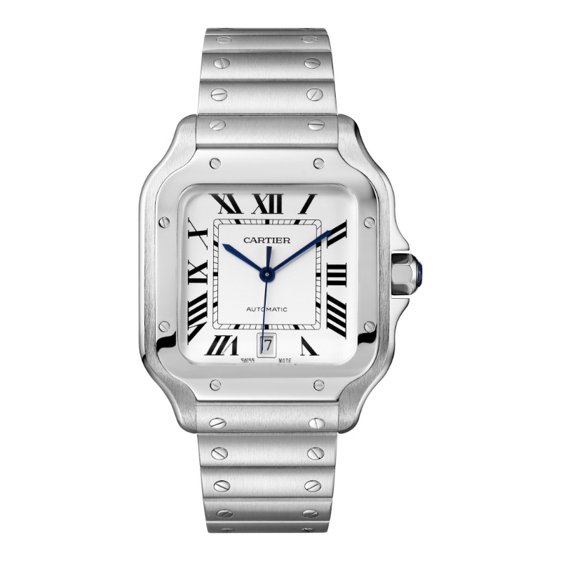 Santos de Cartier腕表,大型款,精钢材质,备有日期窗,搭载卡地亚1847 MC型自动上链机械机芯,表冠镶嵌1颗琢面切割合成尖晶石,配精钢表链及小牛皮表带,两者均配备“QuickSwitch”可更换式系统。($57,500)