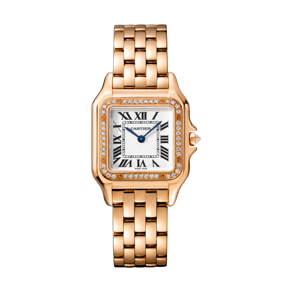 Panthère de Cartier腕表,中型款,玫瑰金材质,搭载石英机芯,表圈镶嵌圆形明亮式切割钻石,表冠镶嵌一颗钻石,配玫瑰金表链。($235,000)