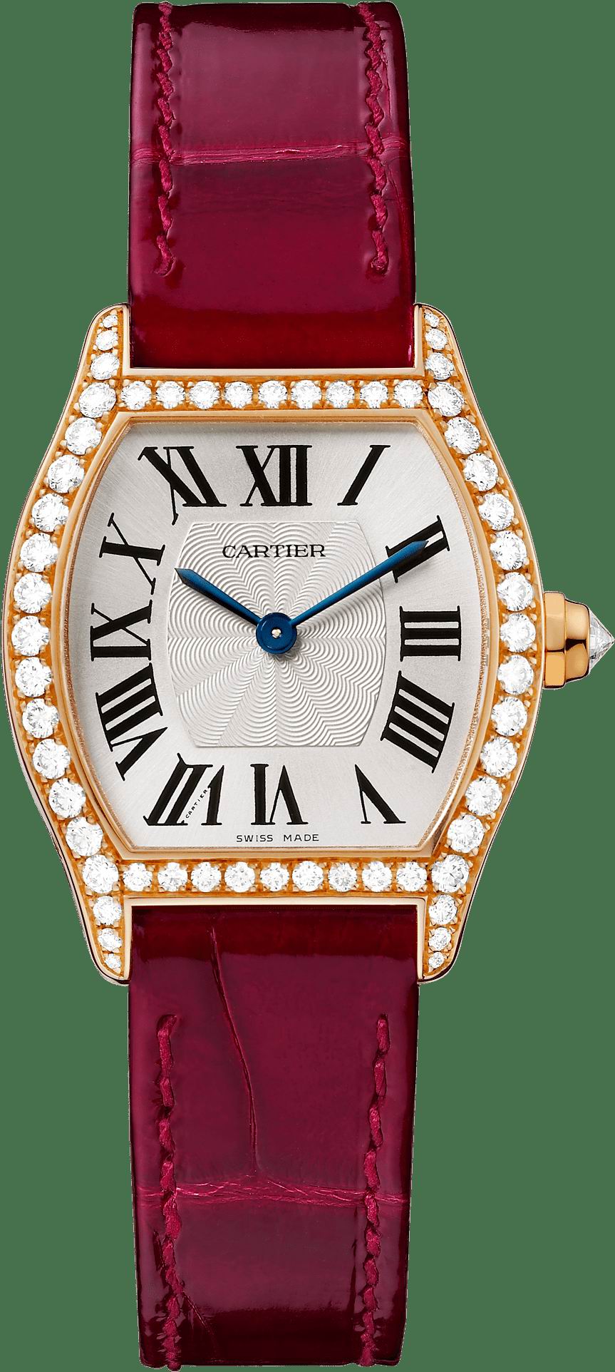 卡地亚Tortue腕表,中型款,玫瑰金材质,搭载8970 MC型手动上链机械机芯,表壳及表冠镶嵌圆形明亮式切割钻石,配深红色鳄鱼皮表带。($299,000)
