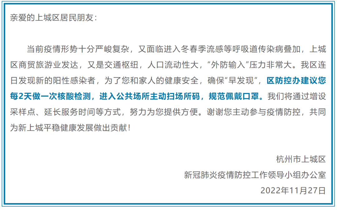 为了您和他人的健康,倡导各类场所对进入人员查验48小时核酸阴性证明。请广大居民不传谣不信谣,积极配合,确保检测工作高效完成。