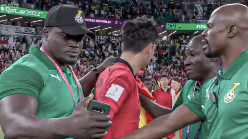 孙兴民赛后泪流满面,加纳教练团也上前安慰。但有一位不识趣的教练竟然拿出手机想和孙兴民自拍,孙兴民明显没心情转身拒绝,加纳助教佐治保定(George Boateng)示意同伴不要胡来,并且狠狠瞪了该教练一眼。