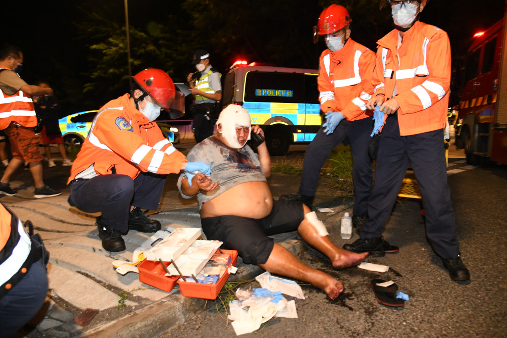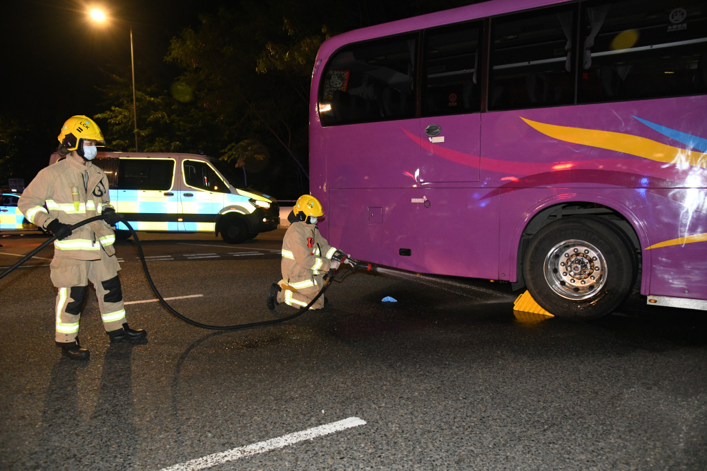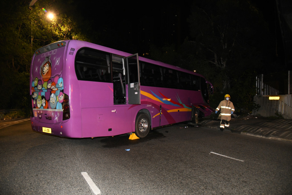 事发时旅游巴沿连翔道往尖沙咀方向,驶近美青路回旋处时突失控撞壆,乘客前推后恐多人受伤,报警求助。消防接报后派出多部救护车、消防车及流动医疗车到场处理。其中身形肥胖姓江(43岁)司机当场头破血流,坐在路边待救,其他乘客则大多擦伤。旅游巴疑在意外后有漏油情况,消防亦开喉戒备。
