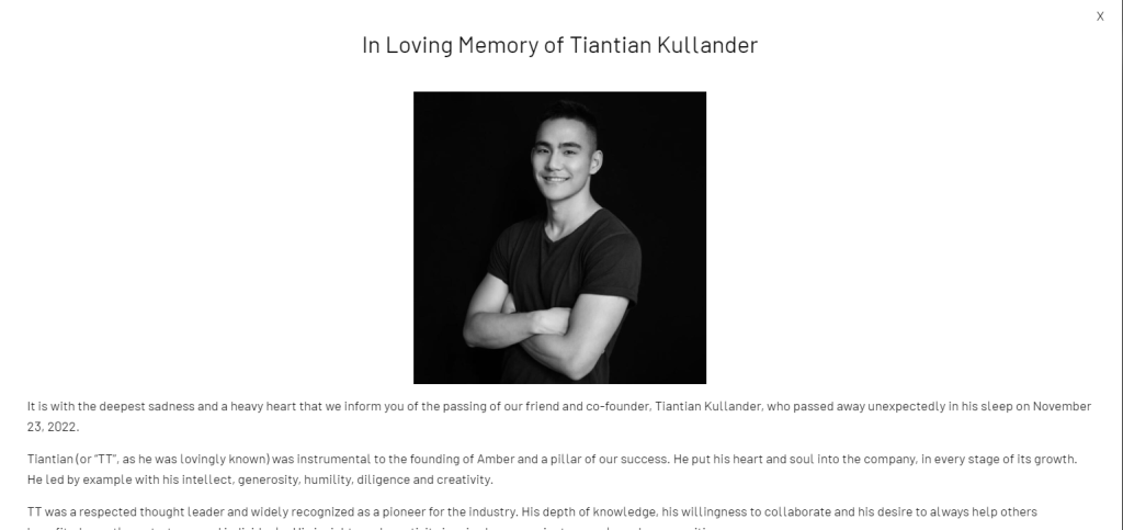 ▲总部位于香港的Amber Group发声明宣布库兰德的死讯,哀悼库兰德的离去。
