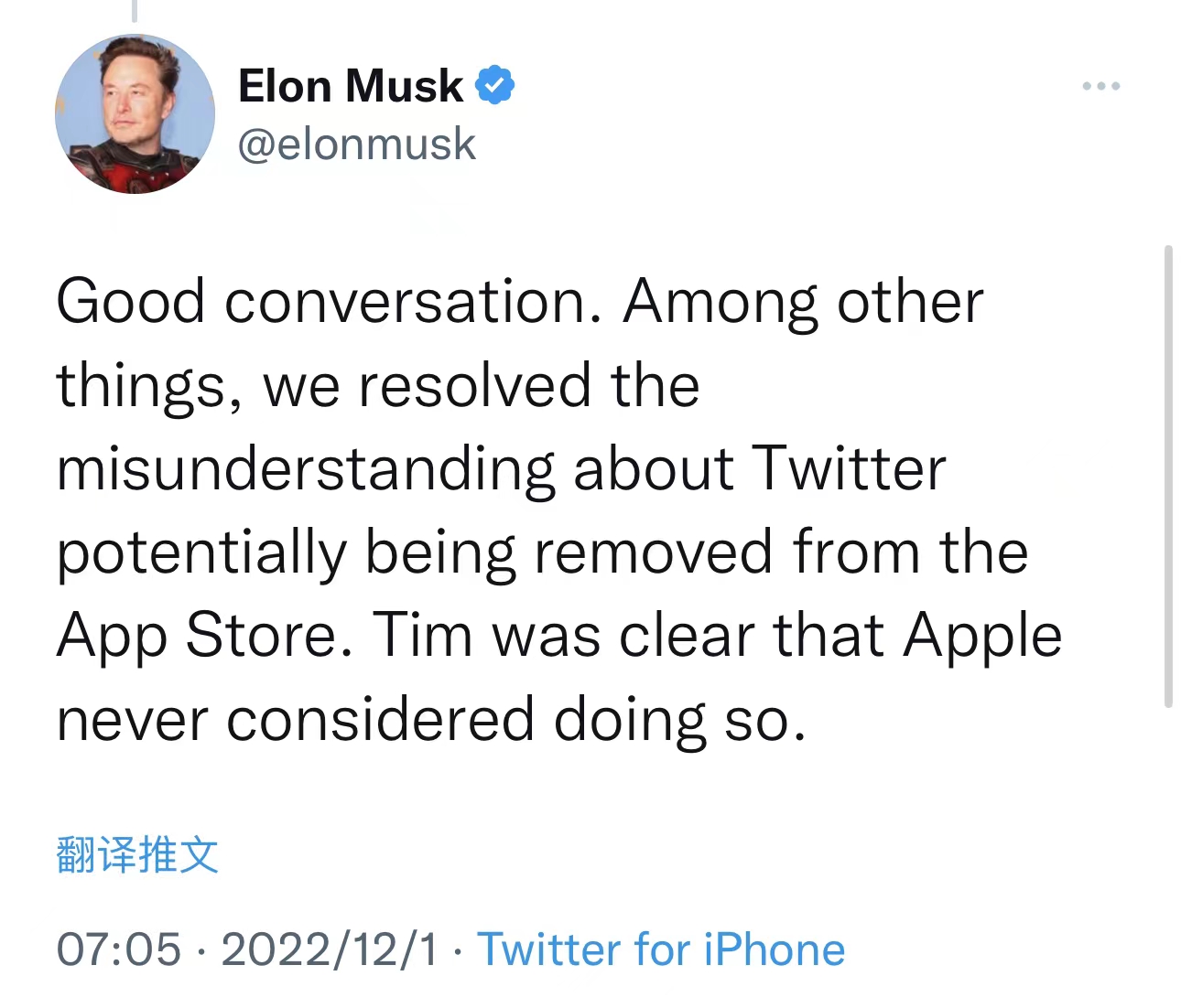 首页>美国>财经 冰释前嫌?马斯克称和苹果误会已解决 2022-12-01 10:05 马斯克早些时候在推特发文称,和蒂姆·库克(苹果公司CEO)进行了友好的对话,解决了关于推特可能被从App Store下架的误会。“蒂姆很清楚,苹果从未考虑过这样做。” ▲马斯克推特。 马斯克还晒出了一段视频,并在配文中表示,“感谢蒂姆·库克带我参观苹果公司的总部。” ▲马斯克推特。 此前,马斯克曾发布多条涉及苹果公司的推文,并称苹果公司威胁要将推特从App Store中下架。 来源:中国新闻网 专题 更多 > 中芯国际上半年营收预计超22亿美元,四季度将试产7nm工艺 太兴盈喜料多赚逾3倍,指将坚守审慎理财政策 中国移动半年多赚5%,中期息增近6% 清华女学霸创业、一年一融资,镁佳股份估值9.3亿美元冲刺港交所 应收账款走高,丰沃股份三成收入打“白条” 惠科股份IPO:获政府补助超53亿,向实控人堂弟采购超8亿 关税战|白宫:特朗普签行政命令,对华关税暂缓期再延长90日 高盛:64%关税成本由美企“买单”,消费者仅承担22% 美媒:特朗普政府通过关税施压,要求买美国军火 热门文章 美国商务部撤销许可喊停,英特尔可继续向华为供应芯片 台湾政治人物声望:卢秀燕满意度第一,柯文哲雪崩式暴跌 泰18岁美籍男被指性侵2母马致其怀孕,马主拍下恶心行径 华裔美魔女离奇伏尸纽约河,曾被指诈骗同胞600万美元 英媒称中国吸收外资创30年最低,中国驻英使馆:严重误导 乌克兰无人机深入俄国境内820公里,重创炼油厂 挖泥船进金厦水域要驱离?栗正杰:海巡给自己找台阶下 台美官员证实:萧美琴已抵达美国从事私人访问 有玄机?赖皮寮谷歌实景突披“朦胧面纱”,网一看全炸锅 大赞卢秀燕“真的厉害”,沈富雄曝与她私聊内幕