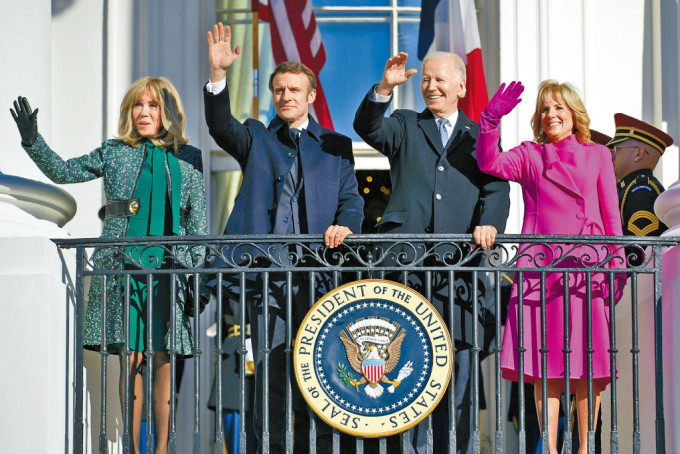 ▲白宫周四为马克龙举行欢迎仪式,马克龙伉俪与拜登伉俪站在蓝厅阳台挥手致意。