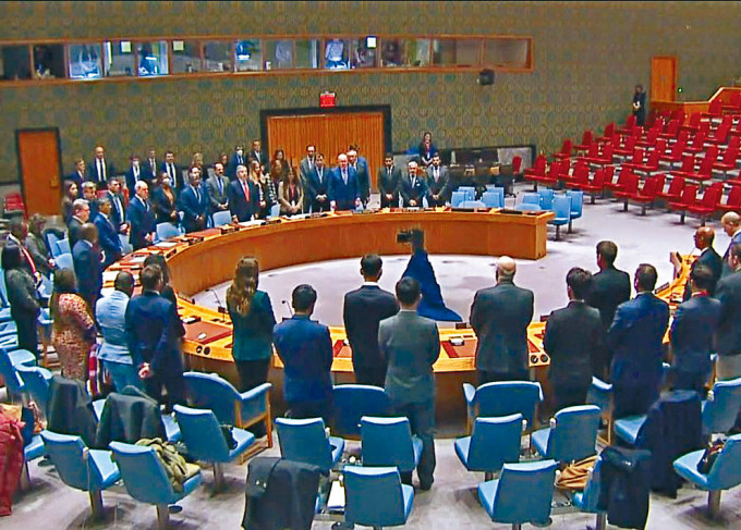 ▲联合国安理会全体成员起立,为江泽民逝世默哀。