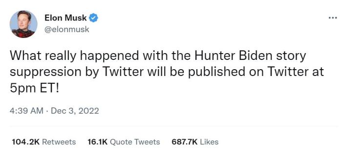 ▲马斯克在推特上预告,将公布“推特为拜登儿子亨特删帖”传闻的内部消息。